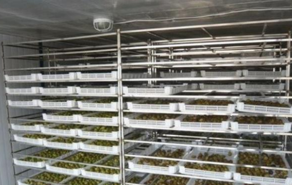 無花果整顆烘干,需要的時間較長一些,先將無花果均勻碼在物料車內(nèi),推入烘干房干燥25-30小時后,再推出烘房外陰涼的地方放置一天,再推入烘房內(nèi)進行二次的烘干。無花果烘干機一天的烘干量視機型規(guī)格決定,少的以600-800 斤一個批次,多的2000斤一個批次,10000斤甚至更大產(chǎn)能則考慮對吹及組合方式即可。無花果干燥冷卻后還要有一個回軟的過程,注意用塑料薄膜保護好,以防細菌滋生。經(jīng)過2天左右的回軟過程即可封袋包裝入庫了。