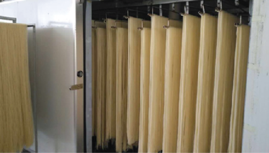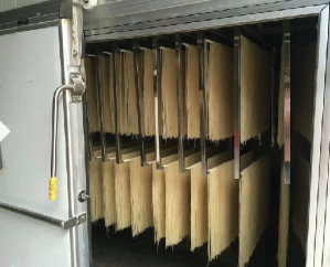 米粉如果放置形式為掛起來的,對風(fēng)路有影響,需要加裝軌道電機來使風(fēng)量和熱量更均均。否則,容易出現(xiàn)風(fēng)路前面的過干,而風(fēng)路尾端又還沒有干的情況。烘干過程中,宜以低溫大風(fēng)量為合適。過高的溫度,極容易出現(xiàn)斷粉。風(fēng)量不夠,傳熱不均,也是另外一個很重要的問題。另外,烘干后不要馬上拉出來,烘干房內(nèi)外溫差過大,極容易造成米粉卷曲變形,造成外觀缺陷。