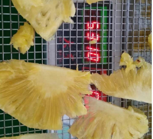 切好的菠蘿片進入熱泵烘干系統(tǒng)里烘干的過程,可以分成5段完成,一段,烘干,不除濕,時間1.5個小時,內(nèi)外溫度一致,溫度50度,二階段,溫度53度,開始連續(xù)除濕,除濕到40%,第三階段溫度58度,連續(xù)除濕,濕度26%,第四階段溫度55度,濕度20%,連續(xù)除濕,第五段溫度48度,濕度18%,連續(xù)除濕1小時,烘干完成。