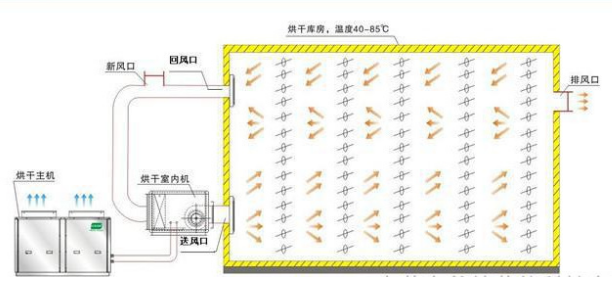通過壓縮機(jī)做功,驅(qū)動管路中的傳熱工質(zhì)吸收外界環(huán)境中的熱量(空氣中的熱量)在進(jìn)行壓縮做工使其變成高溫高壓氣體,再通過換熱裝置將熱量釋放到烘干房內(nèi),通過熱風(fēng)循環(huán)系統(tǒng)進(jìn)行不斷烘干的過程。