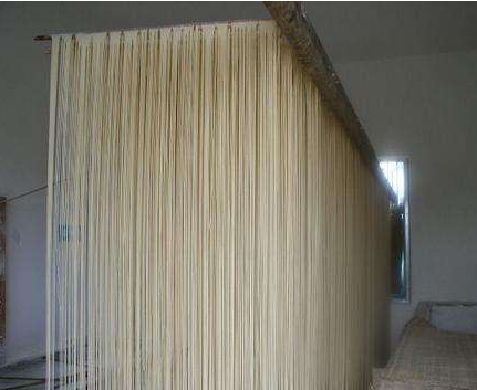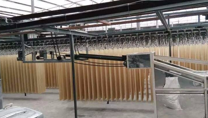 自然干燥就是在風(fēng)和日暖(氣溫不低于20℃)相對濕度 60%一 80%的地區(qū)或季節(jié),將濕面條掛在掛桿上,自然風(fēng)干。由于烘干時(shí)間長,因此產(chǎn)品質(zhì)量好且不易出現(xiàn)酥面。我國民間多用此法。烘房干燥可分為固定式與移行式兩種,前者掛桿固定,將面條掛在掛桿上后送入烘房,經(jīng)熱空氣吹干,屬間歇式生產(chǎn)。移行式烘干是一種連續(xù)烘干方式,在一隧道式烘房中進(jìn)行,干燥裝置由鼓風(fēng)機(jī)、散熱器、熱風(fēng)管道、擴(kuò)散風(fēng)扇用濕機(jī)等組成,移行裝置由機(jī)架、鏈條、鏈輪、傳動(dòng)軸、電動(dòng)機(jī)等組成,面條掛在冊上進(jìn)入烘房,在烘房中緩緩移行,達(dá)到干燥要求。